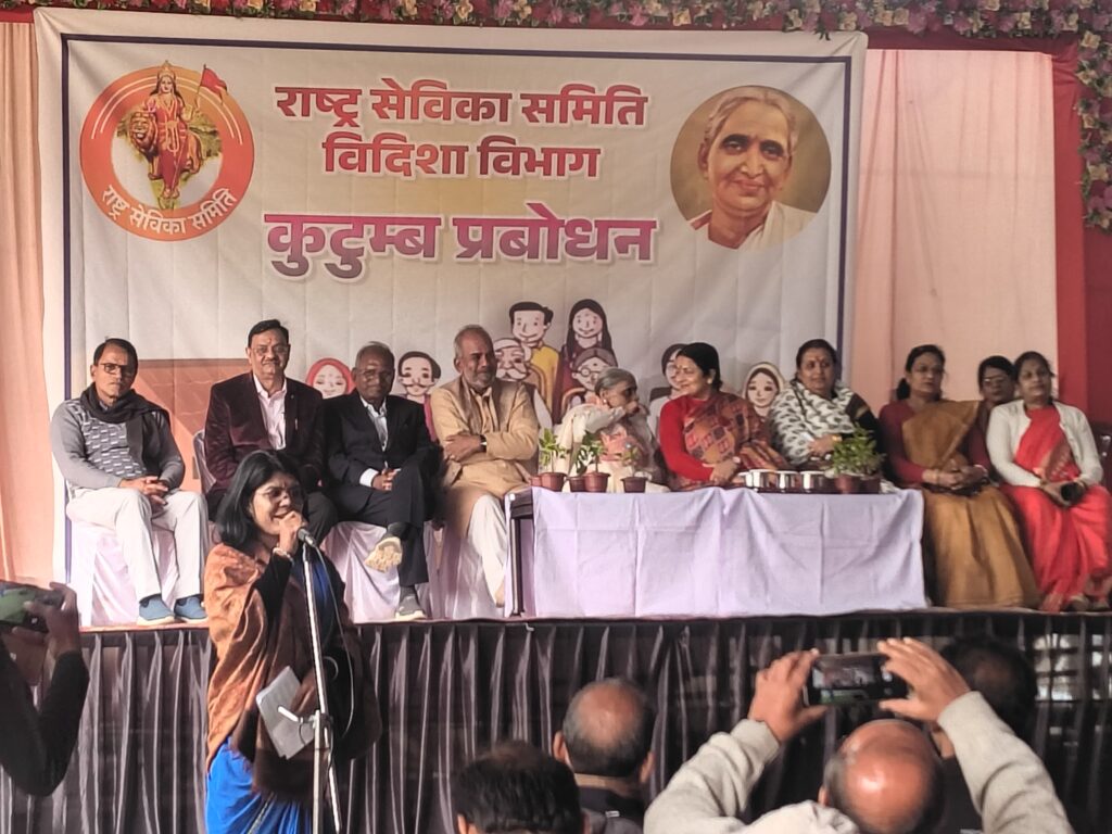 राष्ट्र सेविका समिति के 90 वर्ष एवं राष्ट्रीय स्वयं सेवक संघ के अवसर पर विदिशा विभाग के कुटुंब प्रबोधन गतिविधि के अंतर्गत, रविवार 25 जनवरी 2026 को परिणय गार्डन में कुटुंब गोष्ठी का आयोजन किया गया जिसमें श्री प्रदीप मित्तल जी,घनश्याम बंसल जी और मनमोहन अग्रवाल जी के साथ साथ राष्ट्रीय स्वयं सेवक संघ के जिला संघ चालक खुमान सिंह जी और मुख्य वक्ता के रूप में राष्ट्र सेविका समिति की ग्वालियर विभाग की सह कार्यवाहिका श्रीमती अंजली भार्गव जी उपस्थित रहीं।श्रीमती सुमन सोनी जी द्वारा कार्यक्रम की भूमिका रखने के पश्चात प्रदीप मित्तल जी ने अपने उद्बोधन में संयुक्त परिवार के लाभ बताये तो वहीं घनश्याम जी बंसल ने एक छत एक चूल्हे की महत्ता बताते हुए साथ रहने रहस्य बताया।मनमोहन जी अग्रवाल ने बताया कि संयुक्त परिवार में कार्य विभाजन की कयक महत्ता है।सभी वक्ताओं ने अपबे निजी अनुभव भी साझा किये।मुख्य वक्ता श्रीमती अंजली भार्गव जी ने बताया कि समिति कुटुंब प्रबोधन को लेकर काम किस तरह कर रही है।अपने निजी अनुभव को साझा करते हुए अंजलीजी ने संयुक्त परिवार से मिलने वाली पारिवारिक सुरक्षा, संस्कार पोषण अवसाद मुक्ति आदि के विषय को लेकर चर्चा की।सेवा भारती से आये हुए बच्चों ने एकल परिवार और संयुक्त परिवार के विषय को लेकर सुंदर नाटक प्रस्तुति दी।श्रीमती पूनम शर्मा जी के नृत्य समूह की बच्चियों ने भी मनमोहक नृत्य प्रस्तुति दी।बच्चों को पुरुस्कार वितरण किरण अग्रवालजी अनीता बंसलजी द्वारा किया गया।कार्यक्रम के बिंदुओं को लेकर ऋतु शर्मा जी द्वारा प्रश्नोत्तरी भी की गई।राष्ट्रीय स्वयं सेवक संघ और राष्ट्र सेविका समिति का ध्येय पंच परिवर्तन को ध्यान रखते हुए कार्यक्रम पश्चात हुए भोजन में लगभग 100 परिवार अर्थात 250 के निकट संख्या में समरसता के भाव से एक साथ भोजन किया और प्लास्टिक मुक्त पर्यावरण को ध्यान रखते हुए भोजन पत्तों के पत्तल में परोसा गया।नागरिक शिष्टाचार और स्व के बोध को लेकर भी चर्चा हुई।कार्यकम की जानकारी राष्ट्र सेविका समिति,नगर कार्यवाहिका श्रीमती आशा बघेल जी द्वारा दी गयी।
